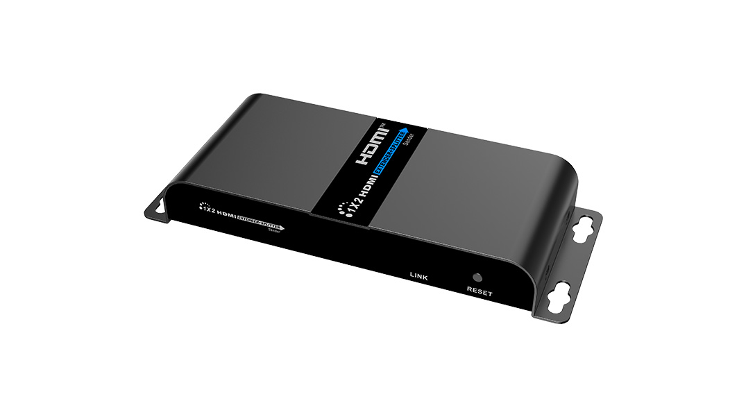 本产品为1进2出高清HDMI™信号网线延长分配器(发射端),集分配和延长功能于一体,可将1路HDMI™信号输入分配至2路RJ45接口输出,1路HDMI™环出,通过CAT6网线, 配合2个接收端使用, 实现HDMI™信号延长40米。